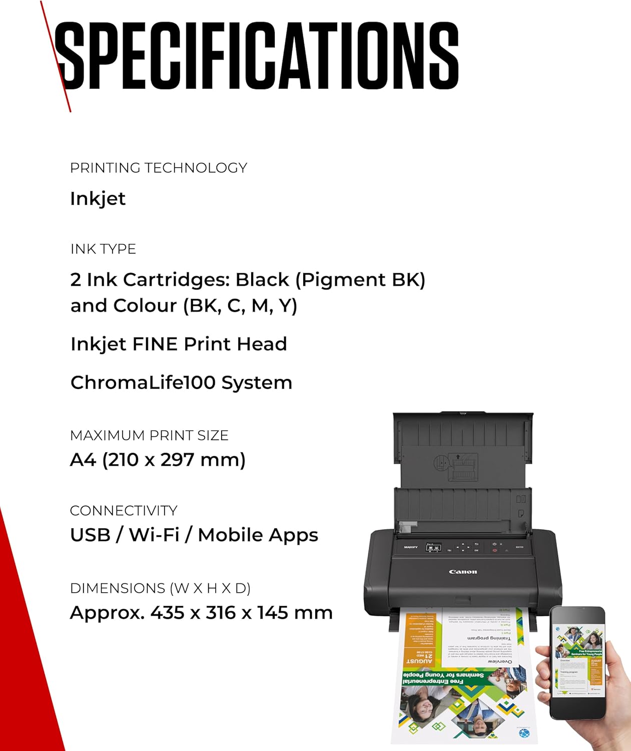 MINI PRINTER: Take your business on the road with this portable printer for home & travel – produces sharp text with pigment black ink & vivid dye-based colours