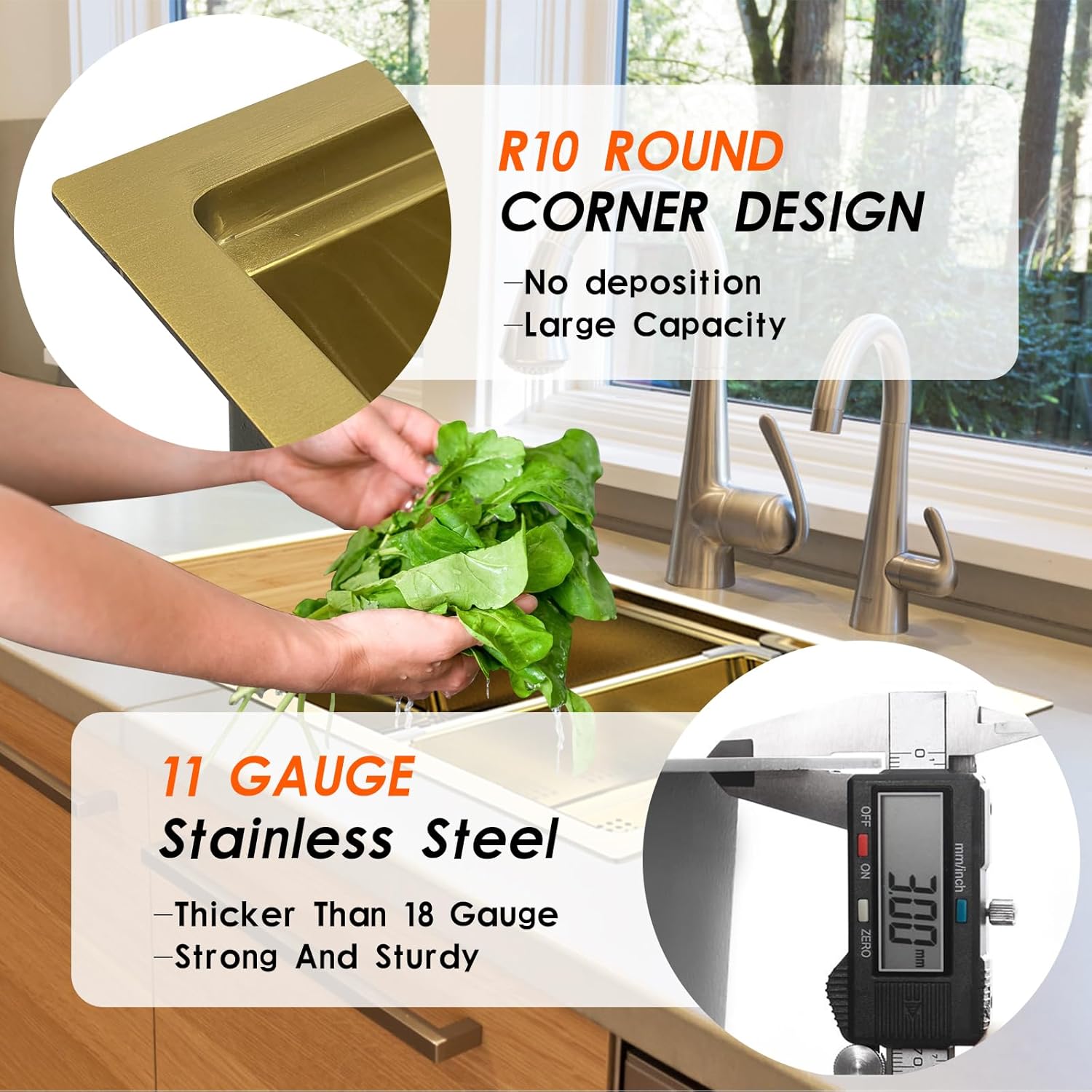 Easy Maintenance: Gold stainless steel kitchen sink workstation is designed for easy maintenance, repelling water and prevents the adhesion of dirt, grime, and stains. Surface technology also make the topmount sink more resistant to scratches caused by utensils, cookware… maintain their pristine appearance.