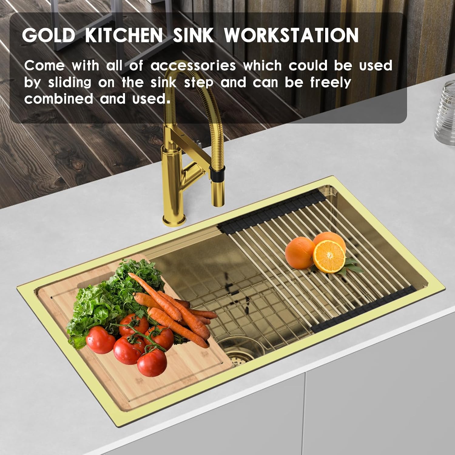 Gold Sink Workstation: With built-in accessories such as a cutting board, drying rack, small basin and colander, single bowl kitchen sink workstation provides a dedicated space for food preparation, dish drying, and rinsing, eliminating the need for separate surfaces and reducing clutter on the countertop.