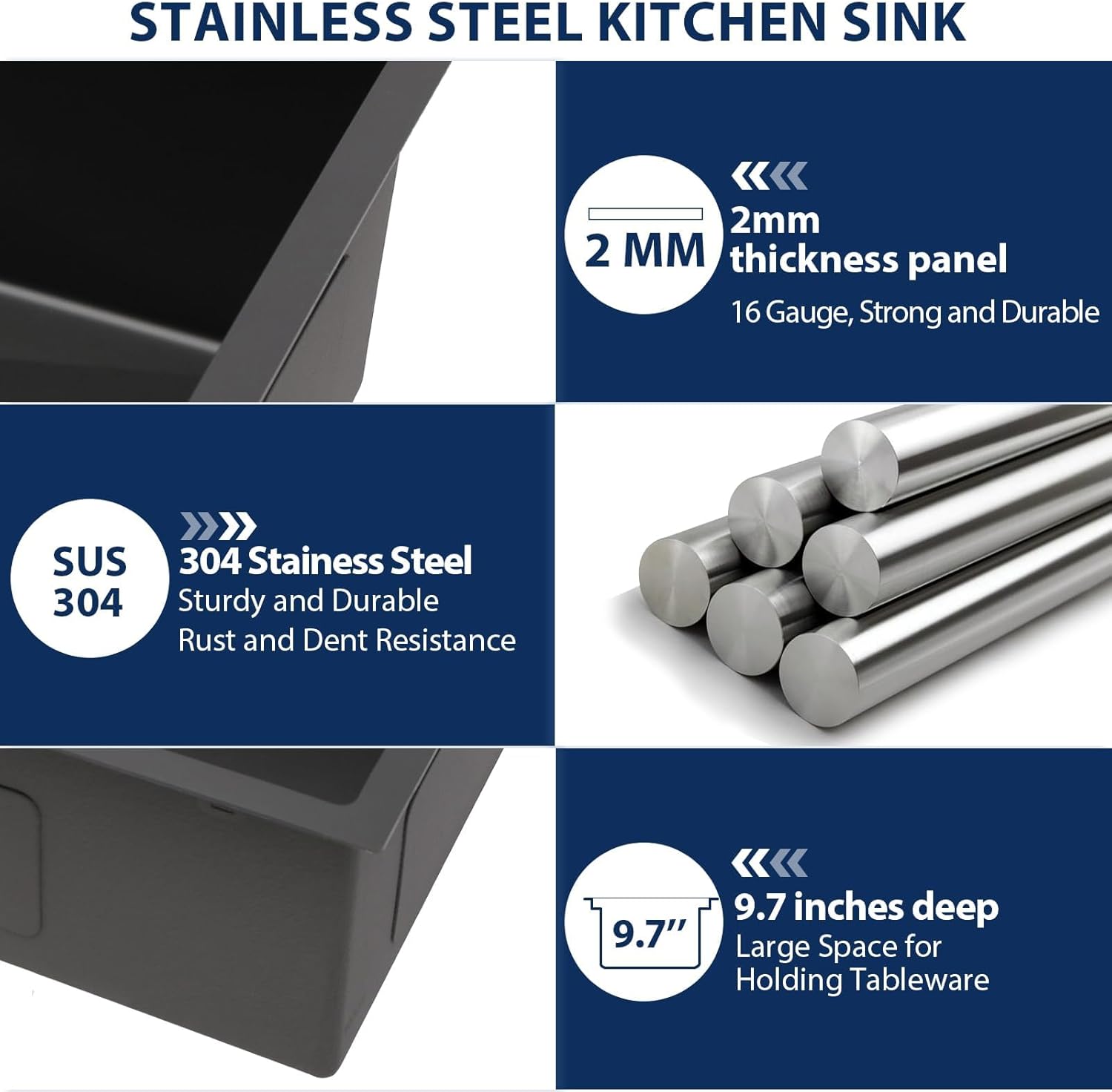 Stainless Steel Matte Black Construction:The 33-inch drop in kitchen sink is crafted from premium SUS304 stainless steel in 16-gauge thickness for superior strength and durability. Matte Black, much darker than gunmetal black in color, please check.