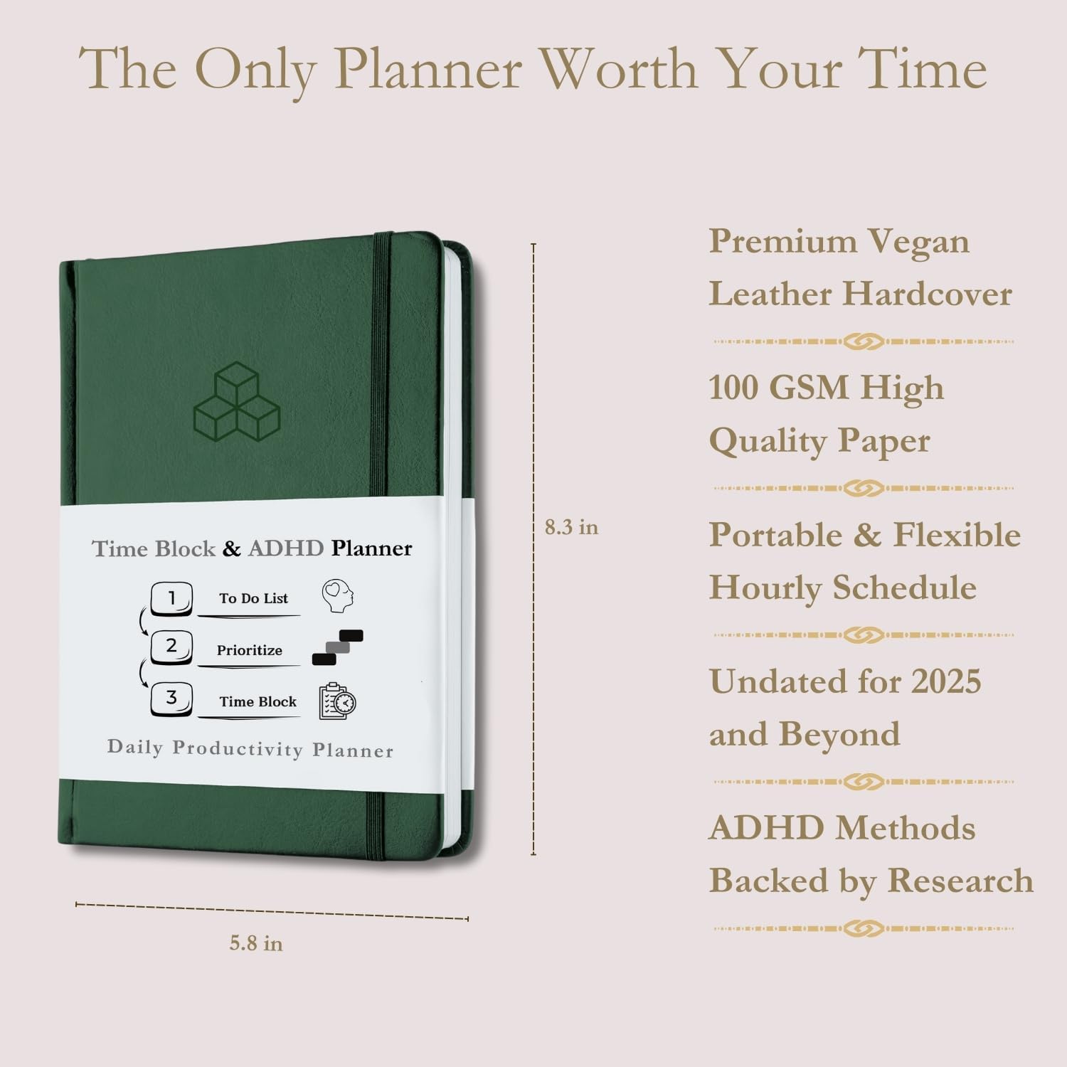 FLEXIBILITY – 180 undated pages for 2025 and beyond. Untimed schedule at the beginning and end of each day to cover 24 hours. Blank pages at the back of the planner for additional space