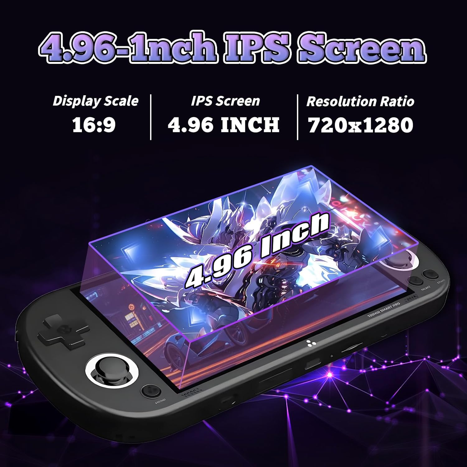 4.96″ HD large screen& RGB ambient lighting: This retro game console is equipped with a 4.96″ IPS full-laminated screen,with a 720×1280 HD resolution that clearly displays detail of the image.The IPS full-laminated screen provides a wider viewing angle and virtually no color deviation.The charging indicator light at the center logo is thoughtfully designed.This emulator handheld’s dual joysticks are equipped with RGB ambient lighting that changes color in sync with your gameplay rhythm